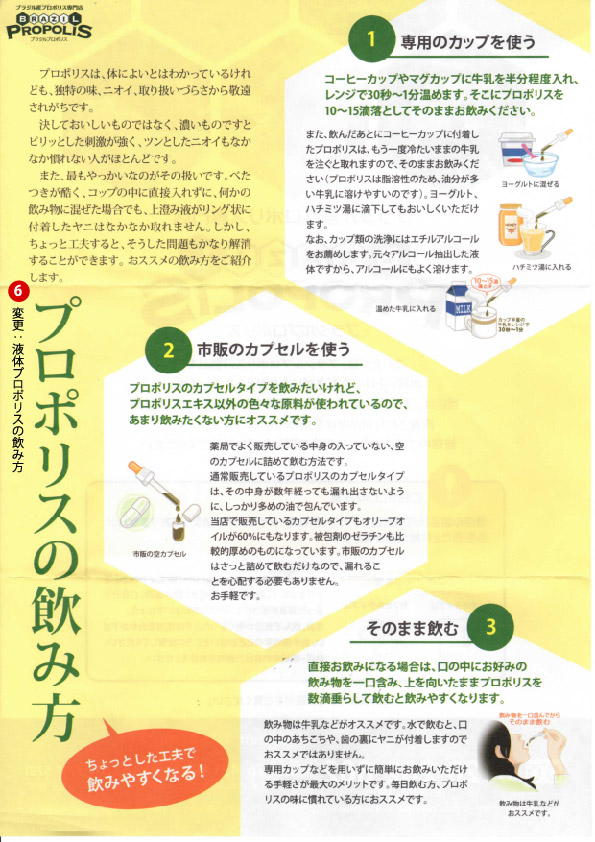 何年経っても飲みにくいのがプロポリスの難しいところですが、慣れてくると皆さん独特で上手な飲み方をされているようです。皆さんも自分独自の飲み方を開発されてみてはいかがでしょうか?